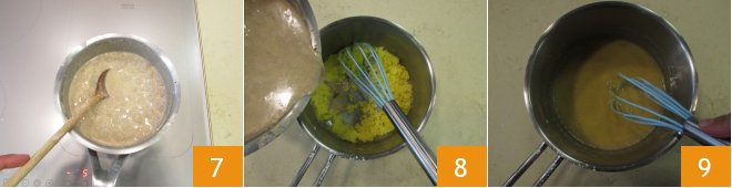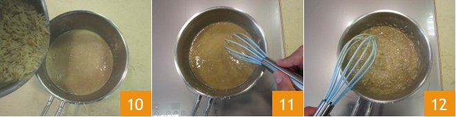 After 15 minutes 7, pour part of the mixture, trying to let only the milk flow and leaving the rice in the pot, into the egg yolk mixture 8. Mix with a whisk to combine 9.