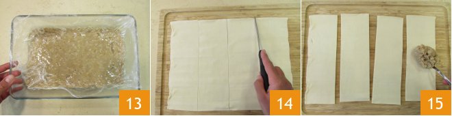 Transfer the obtained cream into a baking dish 13. Cover with plastic wrap and let cool for an hour in the fridge. Once the cream is cold, unroll the puff pastry on a surface and cut 4 strips 3 inches wide 14. Place abundant cream in the center of each strip 15.