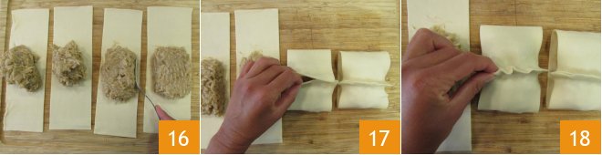 Using a fork, compact it, leaving half an inch free on both sides 16. Now lift both ends of the first strip and bring them towards the center to match them 17. Seal by pinching with fingers 18.