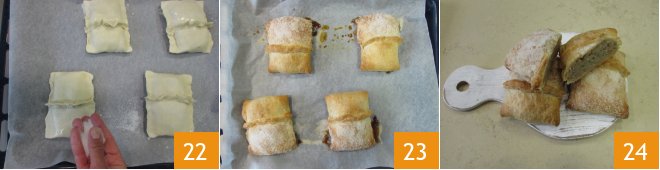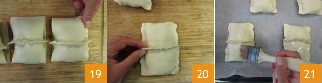 Seal the side edges by pinching with fingers as just done 19. Make sure each bundle is well closed 20 before transferring it onto a baking sheet. Continue this way for the others. Brush just one half of the bundles with a little almond milk 21.