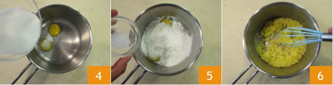 In another saucepan, pour the egg yolks, sugar 4, cornstarch, and salt 5. Immediately mix with a whisk 6 and set aside.