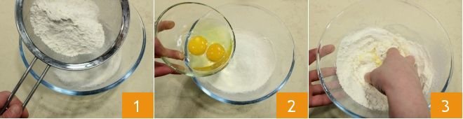 To prepare sweet Carnival tagliatelle, sieve the flour 1 in a bowl, add the eggs 2, a pinch of salt and mix the ingredients 3.