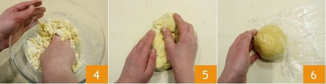 When the mixture becomes more compact 4, transfer it to a work surface and knead briefly 5 to obtain a smooth and homogeneous dough: create a ball and wrap it in plastic wrap 6 to let it rest in the refrigerator for at least 30 minutes.