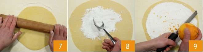 After the necessary time, roll out a sheet about 1-2 mm thick 7 with a rolling pin (you can also use a pasta machine). Sprinkle the obtained disc with powdered sugar 8 leaving about 0.4 inches from the edge and grate the zest of an orange over it 9.
