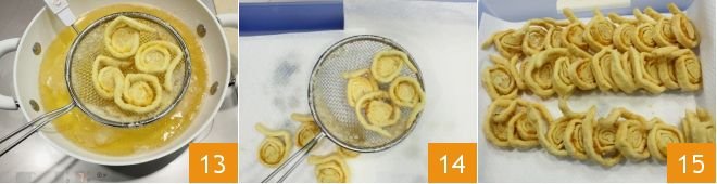 Fry the sweet tagliatelle in plenty of seed oil (a few at a time so as not to lower the oil temperature too much, which must be constant and not exceed 340°F) 13. Then drain them 14 and place them on a tray lined with absorbent paper 15. You can sprinkle them with powdered sugar.