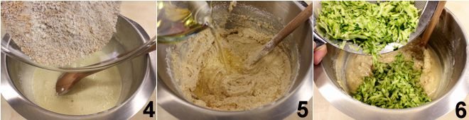 then add the all-purpose flour, hazelnut (or almond) flour, and well-sifted baking powder, then also the seeds from the vanilla bean 4. Also add the vegetable oil 5, mixing well to combine it, and finally the grated zucchini 6.