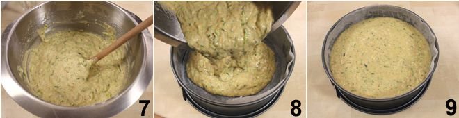 Mix everything 7 and pour the mixture into a 9.5/10-inch buttered and floured cake pan (or lined with parchment paper) (7-8). Bake the zucchini cake for about 60 minutes at 356°F (static oven), checking with a skewer to ensure it's cooked before removing it from the oven. If it darkens too much on the surface after the first 40 minutes, cover it with a sheet of aluminum foil. Let the sweet zucchini cake cool before removing it from the mold. Serve it dusted with powdered sugar!