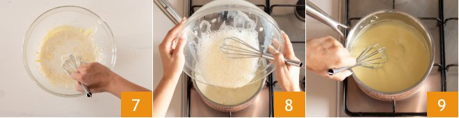 Stir 7, pour the cream back into the saucepan, and return it to the heat 8, cooking it for 3-4 minutes, stirring continuously, until it has thickened 9.