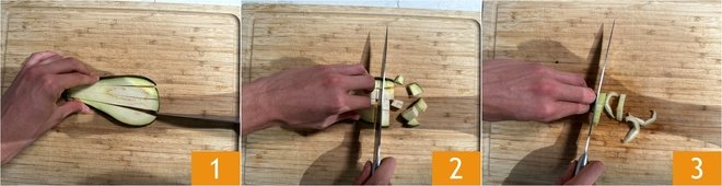 To prepare the swordfish caponata, trim the eggplants and slice them first into 1/2 inch slices 1 and then into cubes 2. Also slice the celery stalks 3.