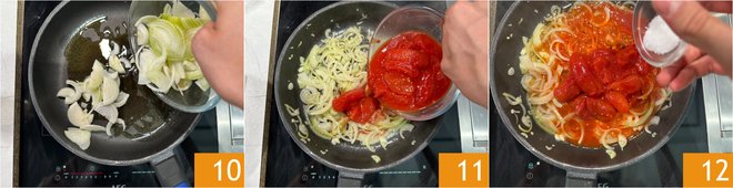 Add the sliced onions 10 and let them sauté over low heat for a few minutes, then pour in the peeled tomatoes 11 and salt 12.