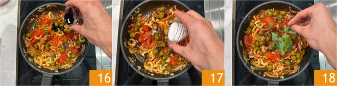 Now pour in the vinegar 16, the sugar 17, and the basil leaves 18.