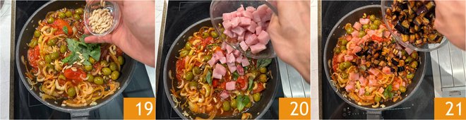 Add the pine nuts 19, the cubed swordfish 20, and the fried eggplants 21.