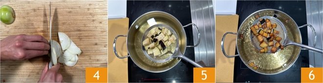 Lastly, clean and slice the onion 4. In a small pot, heat the oil to 347°F, then add the eggplant cubes 5. Fry until golden, for about 2-3 minutes, then drain the eggplants 6.