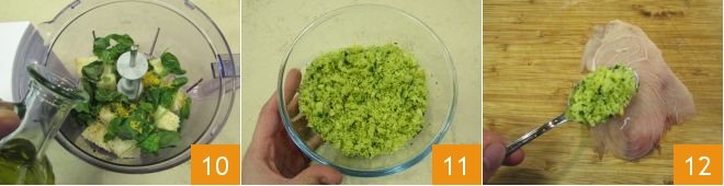 Season with oil 10, salt, and pepper, and blend until you get rather fine and uniform crumbs 11. Spread the swordfish slices on the work surface and add a tablespoon of the obtained mixture, distributing it evenly over the entire surface, being careful to leave the edges free 12.