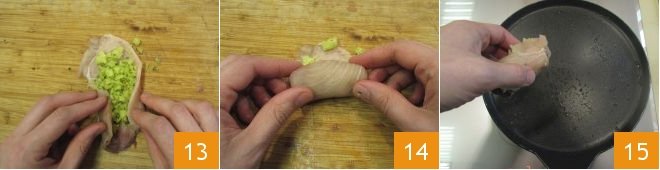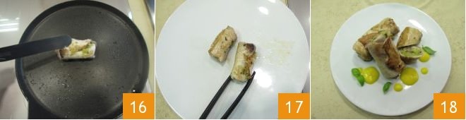 Fold the longer sides inward 13, then roll the slice on itself from bottom to top 14. Proceed in this way to form all the rolls. Heat a non-stick pan with a drizzle of oil, place the rolls with the closure facing down 15, and cook over medium-high heat for about a minute to seal it well.