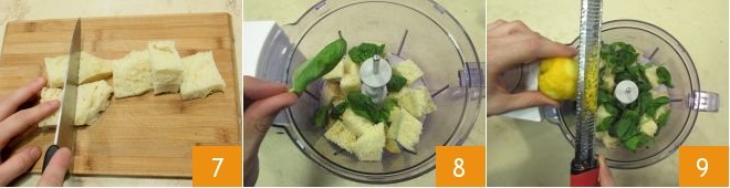 Now focus on the filling of the rolls: cut the fresh bread without crust into cubes 7 and put it in a blender, then add the basil leaves, which you have washed and dried (set aside the smaller ones for the final garnish) 8 and the grated zest of one lemon 9.