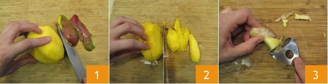 To make the swordfish rolls with mango sauce, start with the sauce: take a ripe mango, remove the skin with a smooth-bladed knife 1, and cut the flesh into coarse pieces 2. Also peel the ginger 3