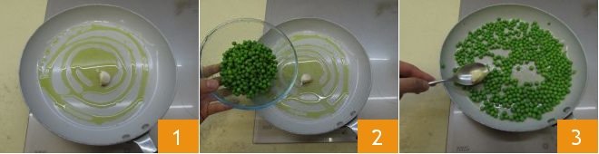 To prepare the tagliatelle with peas and ricotta, first start by making the Vegetable broth. Once you've strained it, keep it hot. Then place a drizzle of oil, a slightly crushed clove of garlic in its skin 1, and let it brown in a pan. Then add the peas 2, sauté them for a minute, then remove the garlic clove 3.