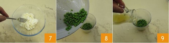 Crumble the ricotta into a small bowl 7 and place both in the refrigerator. After 20 minutes, put a pot full of salted water on the stove and bring it to a boil, it will be used for cooking the pasta. In the meantime, transfer the cooked peas into a blender 8 and add some broth 9.