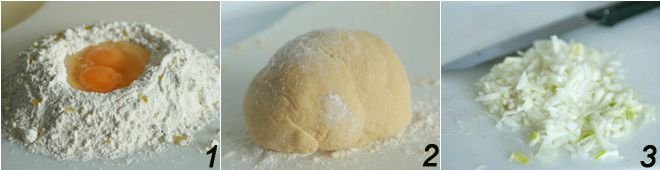 Make a mound with the flour; break the eggs in the center and add the oil 1. Knead until you obtain a smooth and elastic dough 2, which you will wrap in plastic wrap and let rest in the fridge for half an hour. Finely chop the onion 3.