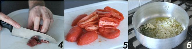 Clean and cut the livers into small pieces 4. Peel, deseed, and chop the tomatoes into small pieces 5. To make it easier to peel the tomatoes, it's good to blanch them in water for a few minutes; the skin will come off more easily. In a large pan, melt the butter, add the onion and rosemary 6, and sauté until the onion is translucent.