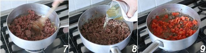 Add the livers and brown them 7, then add the meat 8 and cook everything for a few minutes, then add the broth. Stir in the peeled and chopped tomatoes 9; mix well, salt, pepper, cover with a lid, and let cook on low heat for 40 minutes.