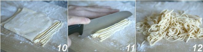 Roll out the pasta, making long strips that you will roll onto themselves 10, and with the help of a knife 11, cut them to a thickness of 1/16 inch, making the tajarin 12. Cook the tajarin in plenty of salted water for no more than 4 minutes. Serve them hot accompanied by the meat and liver ragout.