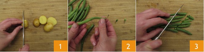 To prepare the vegetable tagine, start by washing and drying all the vegetables you will then cut in this way. Cut the baby potatoes in half 1; first trim the green beans 2 and then divide them in half or into three parts depending on the size 3;