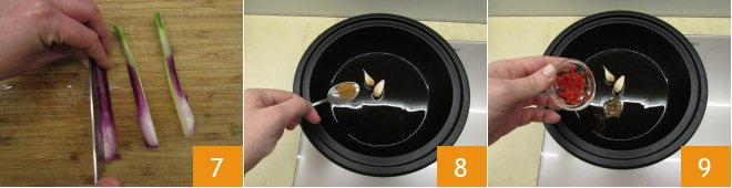 first trim the baby carrots 4 and then cut them in two 5; trim the spring onions 6