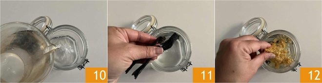 Prepare the dashi broth: pour the water into a glass jar 10, then add the kombu seaweed 11 and the katsuobushi 12.