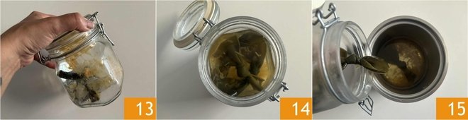 Close the jar 13 and let it steep at room temperature for at least a couple of hours (or even overnight) 14. After the steeping time, transfer the dashi to a small pot 15.