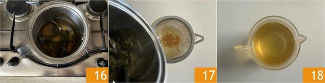 Simmer for a few minutes 16; it should only warm slightly to enhance the flavors. Turn off the heat and strain the obtained broth 17. Weigh 250 g of dashi for the batter preparation and let it cool 18.