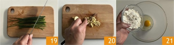 Now finely chop the chives 19 and the ginger 20. Finally, prepare the batter: in a large bowl, pour the egg and the flour 21.