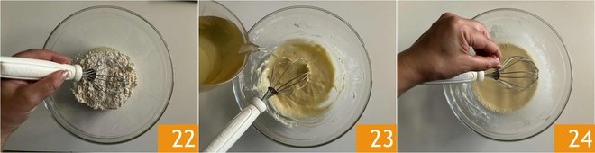 Mix well with a whisk 22, then gradually add the 250 g of dashi while continuing to stir with the whisk 23. Once you have a smooth and homogeneous batter, adjust with salt 24.
