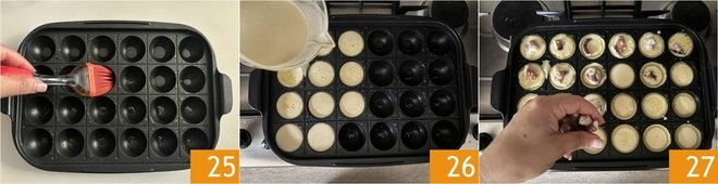 You are ready for cooking: brush the takoyaki plate with a little vegetable oil 25, then place it on the stove with a flame diffuser and heat it well. Using a pitcher with a spout or a ladle, fill the molds with the prepared batter 26. Immediately insert the pieces of octopus 27, chives 35, and ginger 36 into each mold.