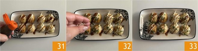 Transfer the cooked takoyaki to a plate and garnish with mayonnaise and okonomiyaki sauce 31. Finish with white and black sesame seeds 32 and a bit of chives. Your takoyaki are ready to be enjoyed 33!
