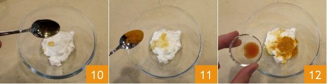 Then add the honey 10 and turmeric 11. Adjust with a pinch of Tabasco to give the sauce a spicy touch 12.