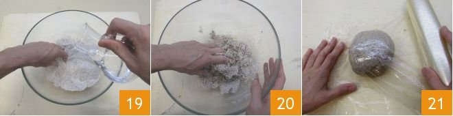 Now also add the water in a stream 19 to knead. Pour the water gradually to check how much water your flours absorb. If the dough seems too liquid, add less than expected, if it is too compact add a little more. Knead vigorously with your hands to create a homogeneous mixture free of lumps 20. Shape your dough into a sphere and cover it with transparent plastic wrap 21: let the dough rest at room temperature for at least 30 minutes in a dry place.