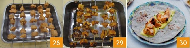 Then take a baking tray about 10 inches on one side (if you want, line it with parchment paper to avoid dirtying it when the tandoori chicken skewers release liquids while cooking). Lay the skewers on a baking tray so that the skewer rests on the edges of the tray and the chicken remains suspended and does not touch it 28. Now place in the oven on grill mode at 482°F for 10 minutes, being careful to turn the skewers halfway through cooking. The chicken should appear almost charred 29. Finally, take the chapati, spread some turmeric sauce in the center and place your tandoori chicken on top of it 30.