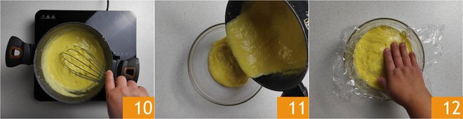 When the custard has thickened 10, transfer it to a bowl 11 and cover it with plastic wrap, making sure it is in contact with the surface of the custard 12. Let it cool.