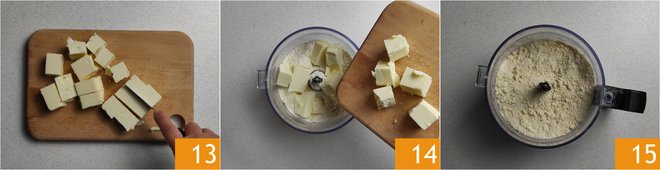 Now move on to prepare the shortcrust pastry: cut the cold butter from the fridge into pieces 13. Pour the flour into a mixer, add the butter and blend intermittently, to avoid the butter heating too much during the process, until you get a sandy consistency 15.