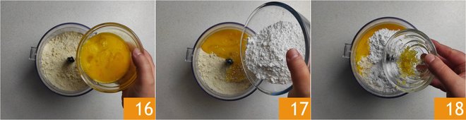 Add the eggs 16, powdered sugar 17, and grated lemon peel 18.