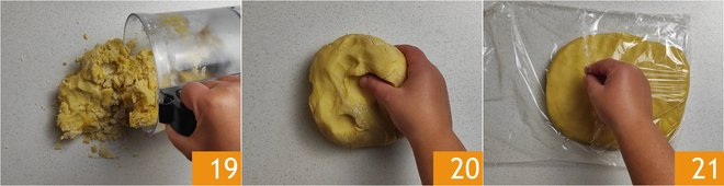 Blend for a few moments on low speed. Transfer everything onto a work surface 19 and work quickly with your hands 20, just enough to compact and form a smooth dough. Flatten the dough, cover it with plastic wrap, and let it rest in the refrigerator for at least 30 minutes 21.