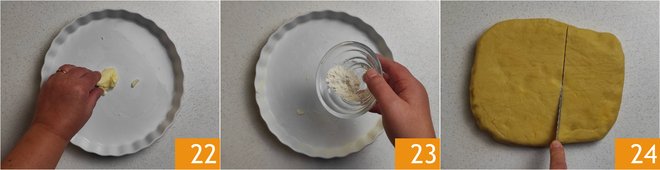 Butter 22 and flour 23 a 9.5-inch diameter mold. Take the pastry from the refrigerator and take two-thirds of the dough 24.