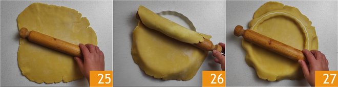 Roll out the pastry with a rolling pin to obtain a sheet about 0.4 inches thick 25. Place it on the mold 26, make it adhere to the edges, and remove the excess by passing with the rolling pin 27.