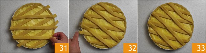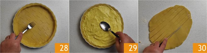 Prick the base with a fork 28 and spread the custard, now cold, inside it 29. Roll out the remaining dough to a thickness of 0.4 inches, then cut strips 0.4 inches wide 30.