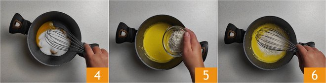Mix with a whisk until you get a smooth mixture 4. Then add the flour 5 and mix again with the whisk 6. You should obtain a creamy and smooth consistency, free of lumps.