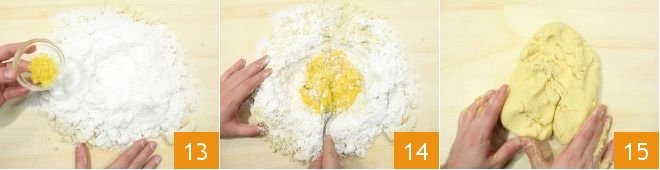 then transfer it onto a work surface (or into a bowl) and add the sifted powdered sugar and lemon zest 13. Create a well in the center and pour in the egg yolks. Mix everything with a fork 14, then continue working the dough with your hands for a few minutes 15, until it becomes compact but not too warm.