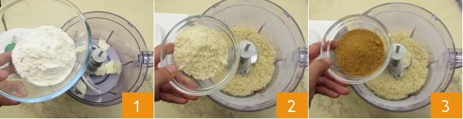 To prepare the tart with matcha tea cream, first start by preparing the shortcrust pastry. Pour the cold cubed butter into a food processor with blades, add the all-purpose flour 1 and blend everything until you get a crumbly texture. Then add the almond flour 2, whole cane sugar 3 and blend again until you get a homogeneous mixture.