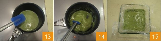 and transfer the mixture back into the saucepan 13. Cook for a few minutes on low heat, always stirring until the cream thickens 14. At this point, pour it into a baking dish, cover with plastic wrap in contact 15 and let it cool in the refrigerator.